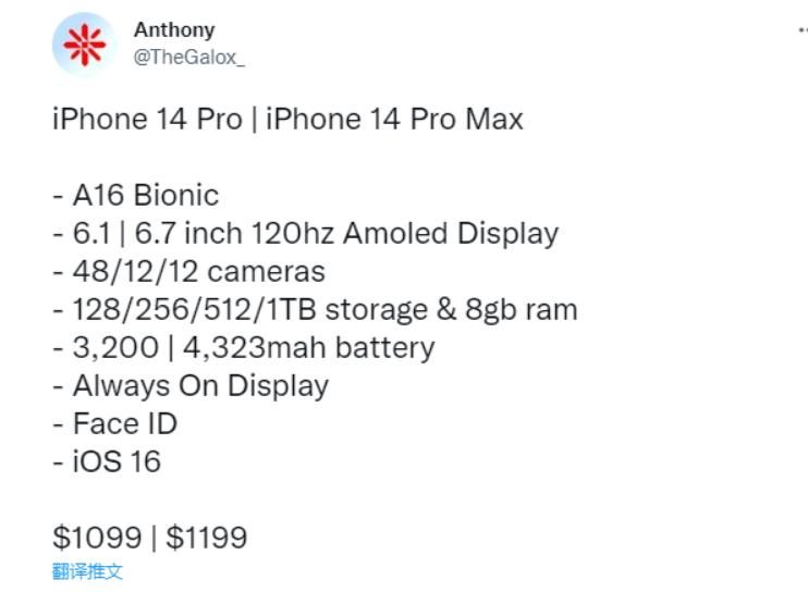 近期,有爆料人士列举了 iPhone 14 Pro 和 iPhone 14 Pro Max 的售价。其中 ,iPhone 14 Pro售价为1099 美元(约7367元人民币), iPhone 14 Pro Max 售价为 1199 美元(约 8037元人民币)。