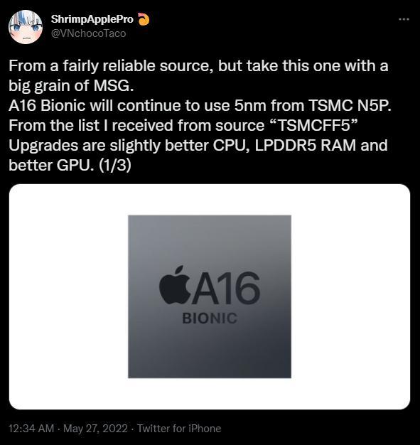 根据推特某博主爆料,苹果A16 Bionic 芯片采用台积电5nm工艺工艺制程,CPU性能增幅在15%左右,CPU综合性能提升42%,GPU提升35%,并搭载全新的LPDDR5内存,较上一代芯片性能提升巨大。