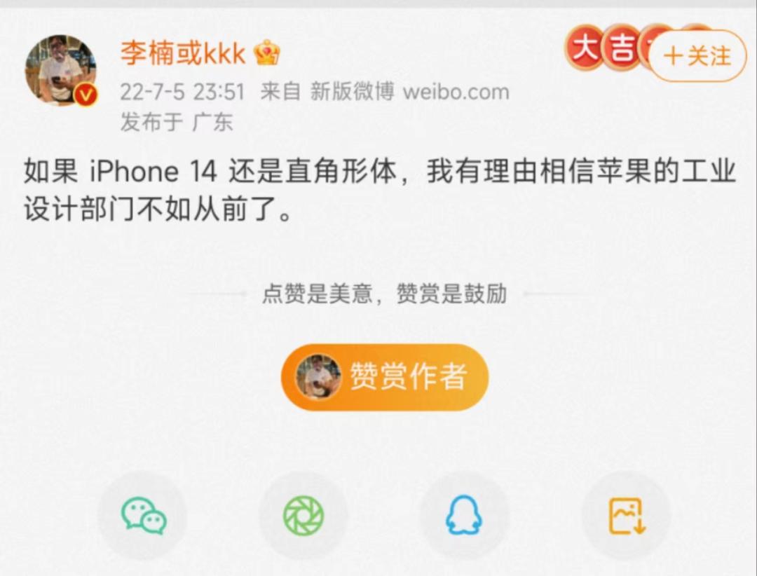 iPhone 14系列依旧采用了直角边设计,虽然很多果粉好这口,但也有人看腻了。早前怒喵科技创始人李楠还发微博吐槽,称:如果iPhone 14还是直角形体,我有理由相信苹果的工业设计部门不如从前了。