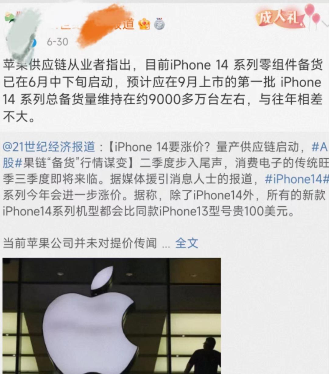据供应链从业者透露的信息显示,iPhone 14系列的零组件备货已在6月中下旬启动,最早可能会在8月初开始正式量产,其中iPhone 14和iPhone 14 Pro将率先开始生产。预计9月上市第一批iPhone 14系列总备货量维持在约9000多万台左右,与往年相差不大。