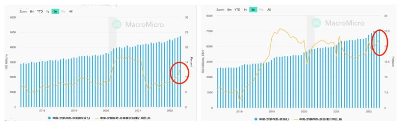 上图为企业和居民定期存款增长情况,进入2022年之后两组数据都呈明显的上升态势,疫情反复下对未来预期不确定性增加,保守主义重新成为主流。