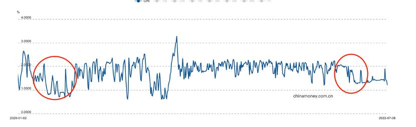银行间隔夜拆解利率一直是衡量货币松紧程度的重要指标,我们整理2020年至今该数据的变化情况,见下图