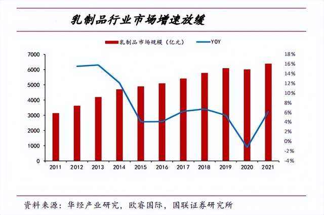 从乳业市场发展来看,随着乳制品行业增速逐渐放缓,据资料显示,目前乳制品行业正从增量转向存量竞争,我国乳制品行业2015年规模为4896亿元,行业增速见顶,之后增速逐年下滑,从量增驱动转向价增驱动。