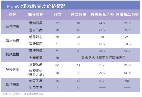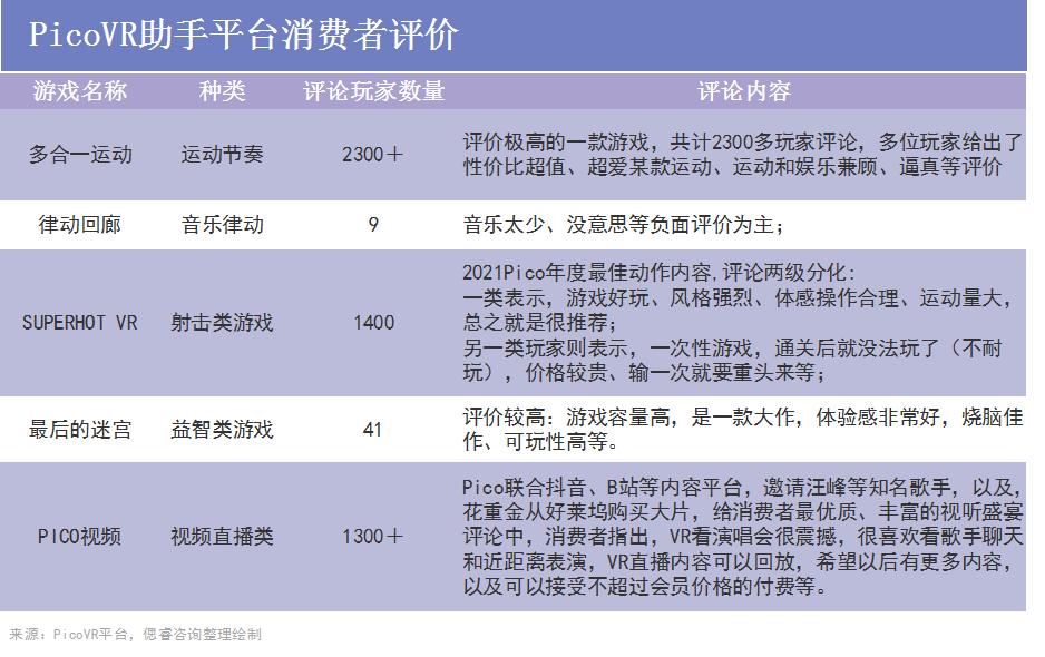 经偲睿咨询调查,截止目前,PicoVR助手中各类内容共计205项,其中游戏148款(运动节奏、娱乐竞技以及益智休闲)。而有媒体统计,截止4月底Quest平台共计357款软件,并且打造了《节奏光剑》《半衰期:爱莉克斯》等标杆性内容。在内容数量和质量上看,目前Pico不敌Oculus。