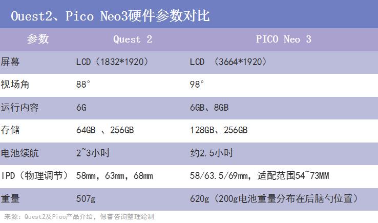 先看硬件参数,以Oculus Quest 2和Pico Neo 3为例: