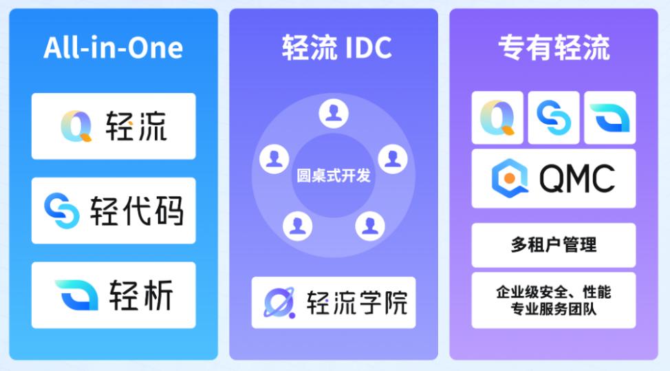 All-in-One应用开发平台由原有的核心产品“轻流”、BI产品“轻析”和“轻代码”三部分组成。