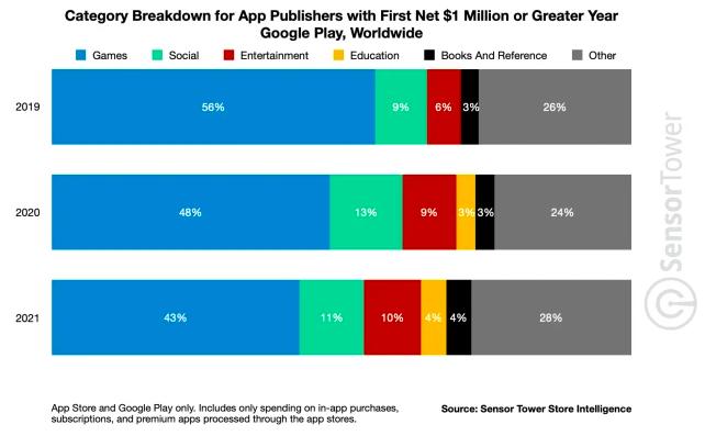 Sensor Tower推测,即使谷歌下调了应用商店佣金,也仅仅是损失了不到3%的应用收入。以2021年为例,如果谷歌应用商店对收入在100万美元以下的开发者收取15%佣金,公司将损失14亿美元,约占谷歌应用商店全年收入(估计为479亿美元)的3%。