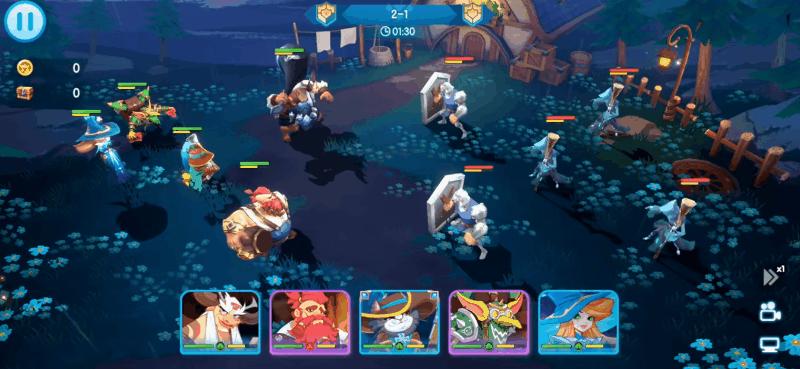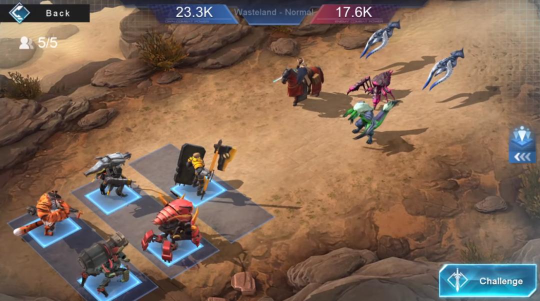 玩法方面比较普通,玩家在战斗开始前在4*4一共16个格子里上阵最多5名角色,游戏按照坦克、输出、刺客等类型对角色进行了分类,比如坦克类角色擅长承受伤害、刺客类角色则可以瞬移到敌方后排进行攻击。