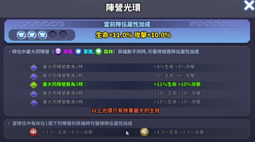不太一样的是,虽然《Valor Legends: Idle RPG》也对角色按5个阵营分类,但只有其中3个阵营是按照上阵数量来进行梯度式的属性加成,另外2个阵营则提供额外的固定数值加成。合计下来也许阵容选择的重要性会有所降低,玩法更简单轻松一些。