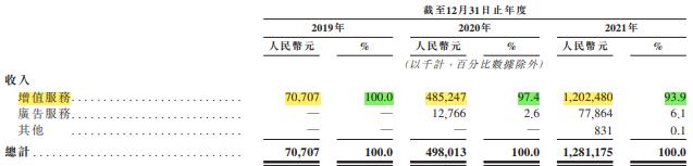 增值服务,也就是虚拟礼物和会员订购。2019年占了Soul营收的100%,2021年稍稍降到了93.9%,因为这年有了“广告服务”和“其它”。