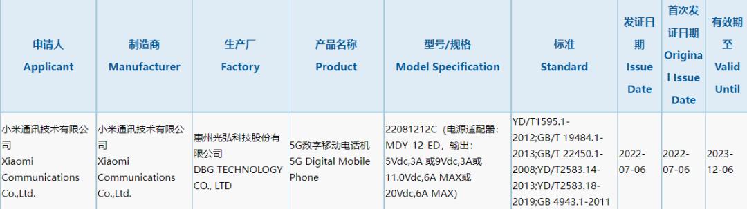 该机型号为 22081212C,配备 120W 充电器——有望支持 120W 有线快充。