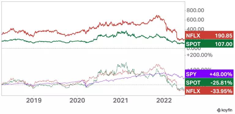 在接下来的三年半里,两家公司在市场的表现都相当不错,但 Netflix 显然表现更好;不过,在过去的这六个月的时间里,一切收益都已化为乌有,而 Netflix 受到的打击要比 Spotify 更大: