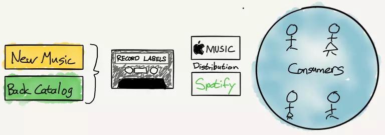 新音乐媒体产业模式 注意到 Spotify 和 Apple Music 的力量是多么的微弱了吗?两者都没有掌握足够多的用户,可以靠纯粹的经济来吸引供应商(艺术家),部分是因为他们没法访问旧唱片。与报纸不同,唱片公司建立了一种超越发行的整合方式。