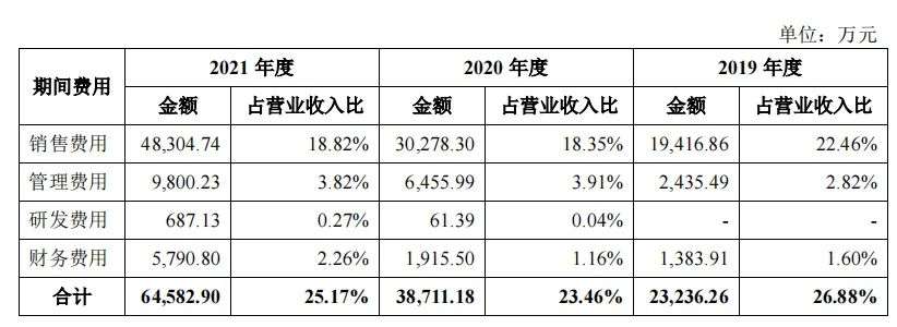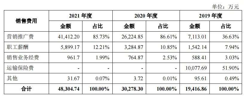 线上销售收入的增加,带来的是线上销售费用的快速增长。随着网购用户增量趋于稳定,主要头部电商平台的商家竞争日趋激烈,边际获客成本有所提高。招股书显示,2019-2021年,认养一头牛营销推广费用分别为7113万元、26225万元和41412万元,占比分别为36.63%、86.61%和85.73%。认养一头牛也提到:“如果公司未来不能及时开发低成本的获客渠道,或者上述销售费用投入无法取得预期效果,公司的经营业绩可能受到不利影响。”