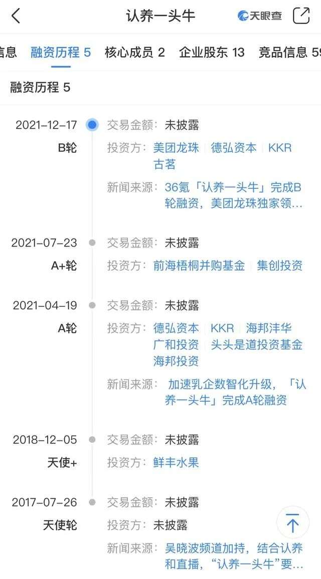 此后,认养一头牛频频被资本看好。2018年,认养一头牛获得鲜丰水果天使+轮融资;2021年4月,认养一头牛获得德弘资本、KKR等资本的A融资,2021年7月,获得前海梧桐并购基金、集创投资的A+轮融资,2021年12月,美团龙珠资本也加入进来,独家领投了认养一头牛的B轮融资。