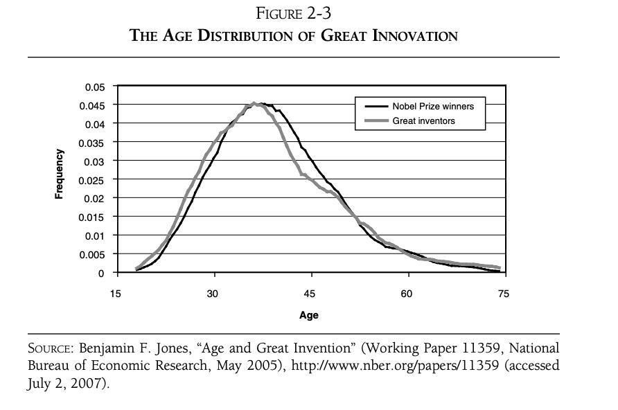 人才的最佳创新年龄?41岁。年龄结构高度影响着产品创新的供需关系。专家通过分析1900-2000年诺贝尔奖得主以及重大专利和产品发明家的年龄数据发现,这些创新者中有42%的人取得创新成就时都是30-40岁。深入分析后,专家得出结论:最佳创新年龄随着时间的推移不断增加。2020年,最佳创新年龄在41岁左右。