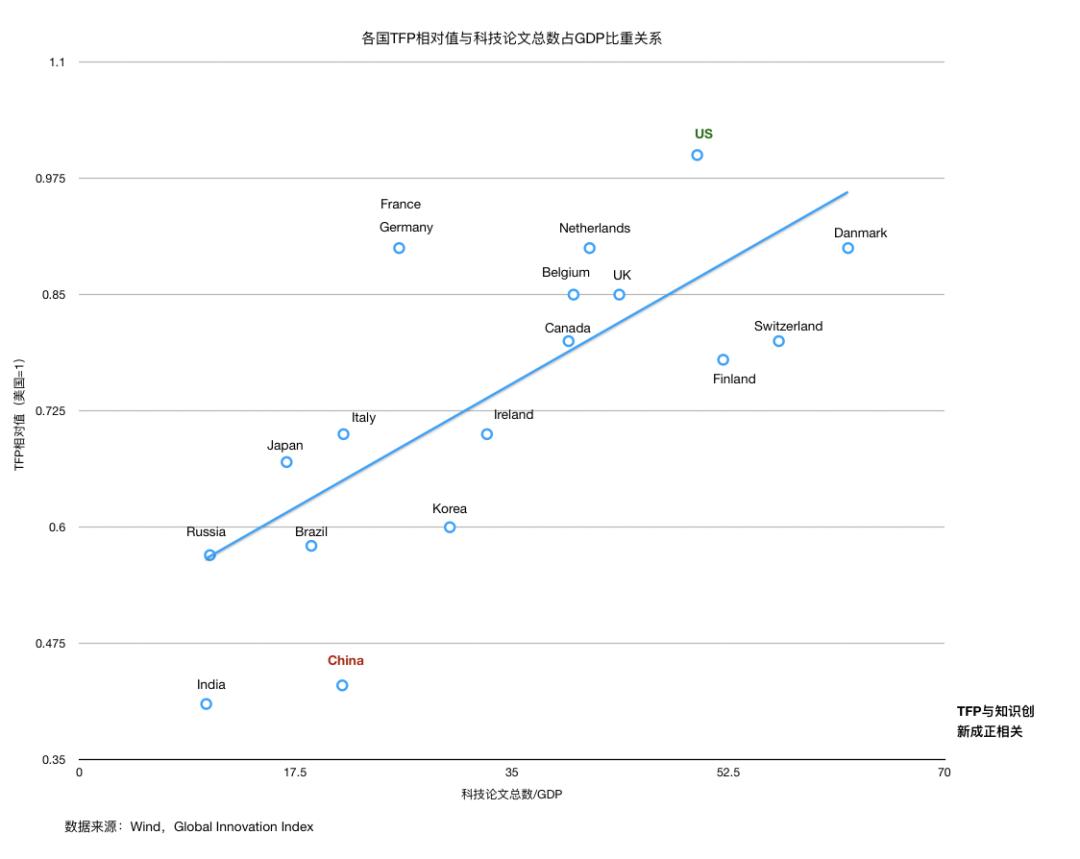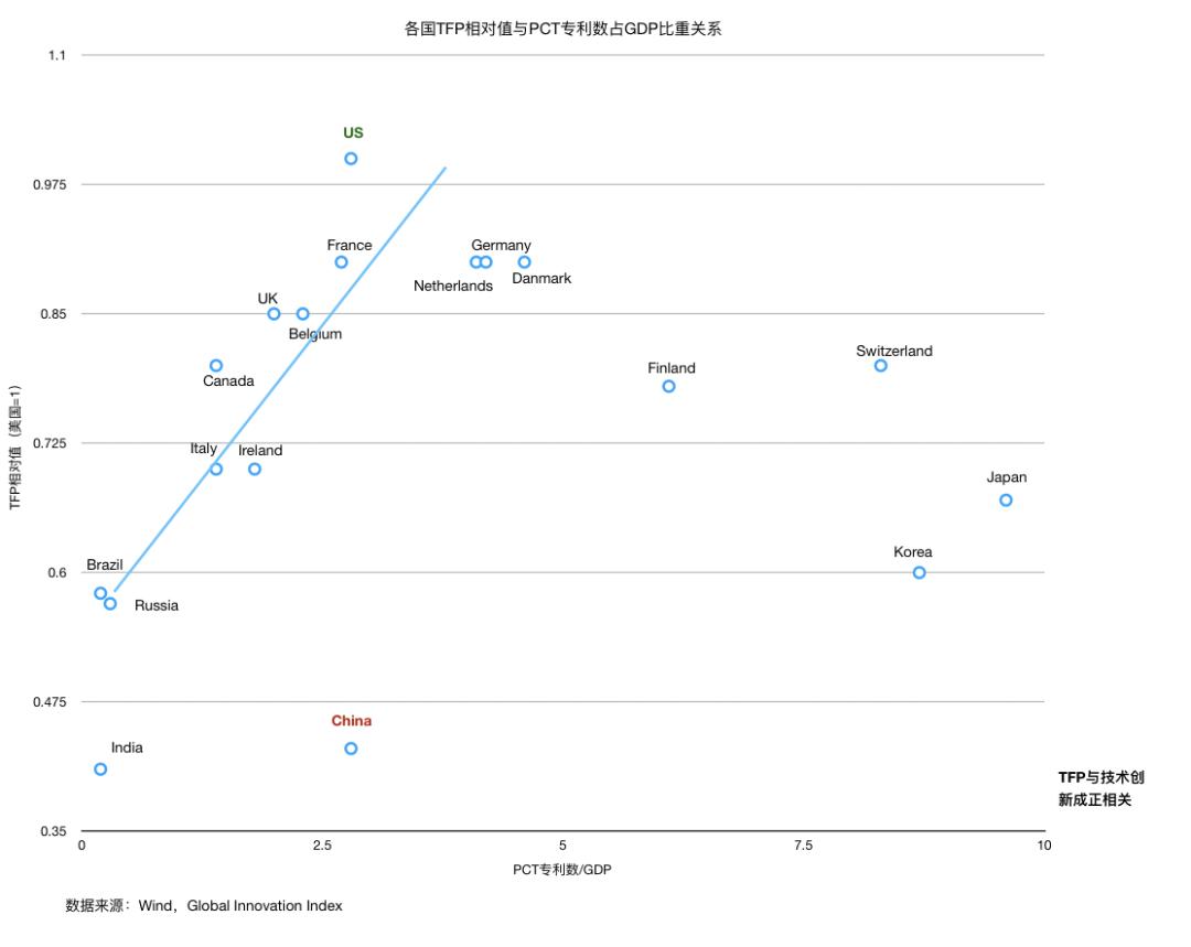 全球经济体常用全要素生产率(Total Factor Productivity,以下简称TFP)来衡量各国的技术创新水平,是洞察经济发展的关键指标。具体来看,TFP是指不包括资本和劳动力等外來输入、其他所有影响产出的要素。简言之,TFP就是生产力。研究表明,不同国家科技论文总数、PCT(Patent Cooperation Treaty)专利数占GDP比重分别与TFP相对值成正相关关系。也就是说,TFP可以衡量国家知识创新与技术创新。