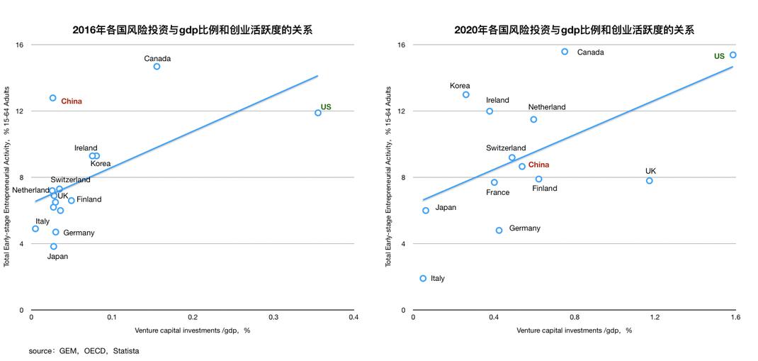 从2016年、2020年各国风险投资与GDP比例和创业活跃度的关系图来看,风险投资促进了创业的活跃度。对比来看,中国尽管风投活跃度上涨但是创业活跃度却有明显的下降;美国的风投活跃度和创业活跃度都在上涨,并且风投对创业的推动效率提高。