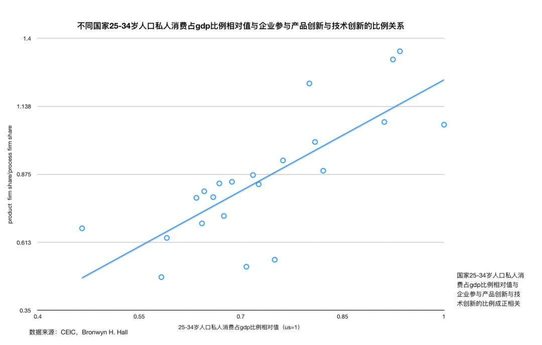 数据表明,25-34岁人口私人消费占GDP比重相对值与产品创新的关系成正比。稳定的高消费需求将促进产品快速迭代,提高创新效率。