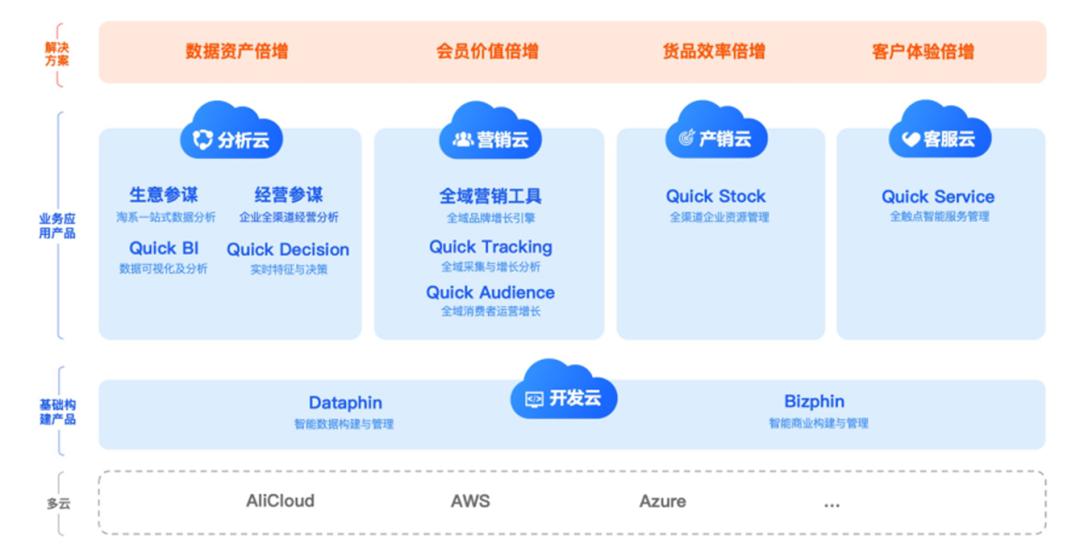 根据瓴羊对DaaS的定义,其打造了分析云、营销云、产销云、客服云、开发云五大产品矩阵,包含Dataphin、Bizphin、QuickAudience、QuickBI、生意参谋、经营参谋等11个核心产品,其中开发云属于基础构建产品,包括智能数据构建与管理的Dataphin,以及智能商业构建与管理的Bizphin,而分析云、营销云、产销云和客服云属于业务应用产品。通过这一产品架构来赋能企业,优化企业在数据资产、会员价值、货品效率和客户体验等方面的能力。