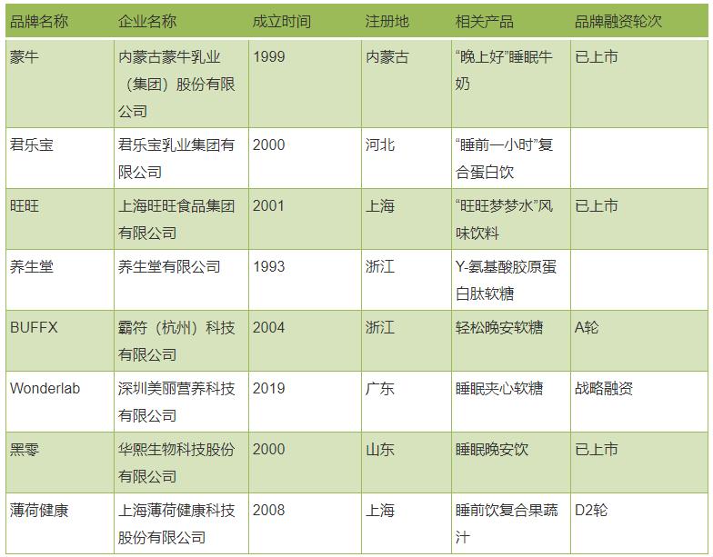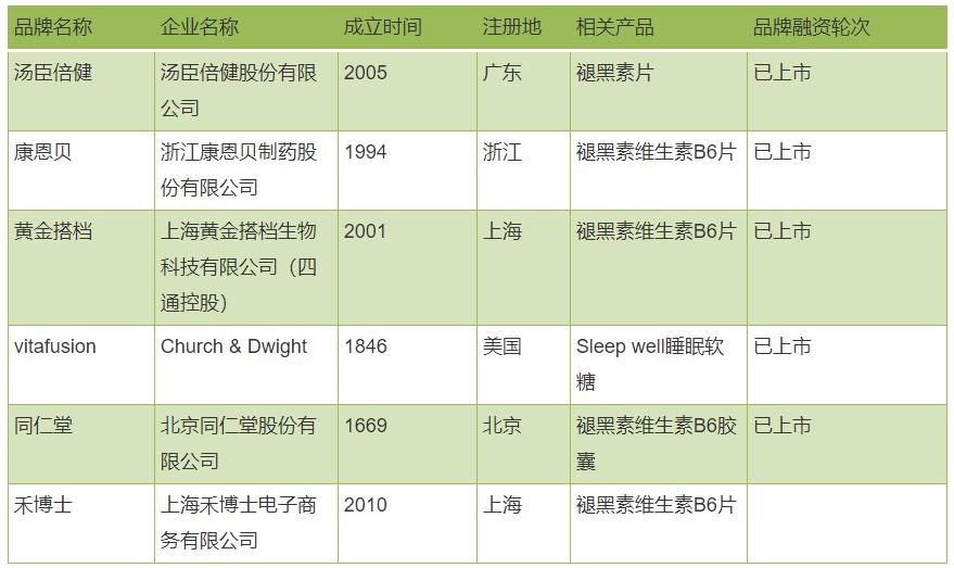 褪黑素是什么呢?按照官方的解释,它是由脑松果体分泌的激素之一,储存在松果体内,其分泌具有昼夜规律,白天分泌受抑制,晚上分泌活跃,可用于帮助入睡和治疗睡眠障碍。90年代,褪黑素在国内被允许作为保健品原料使用,建议用量不超过3mg一天,在此基础上,一些大健康领域的公司纷纷加入了褪黑素研制,其中就包括汤臣倍健、同仁堂,相关企业如下表。