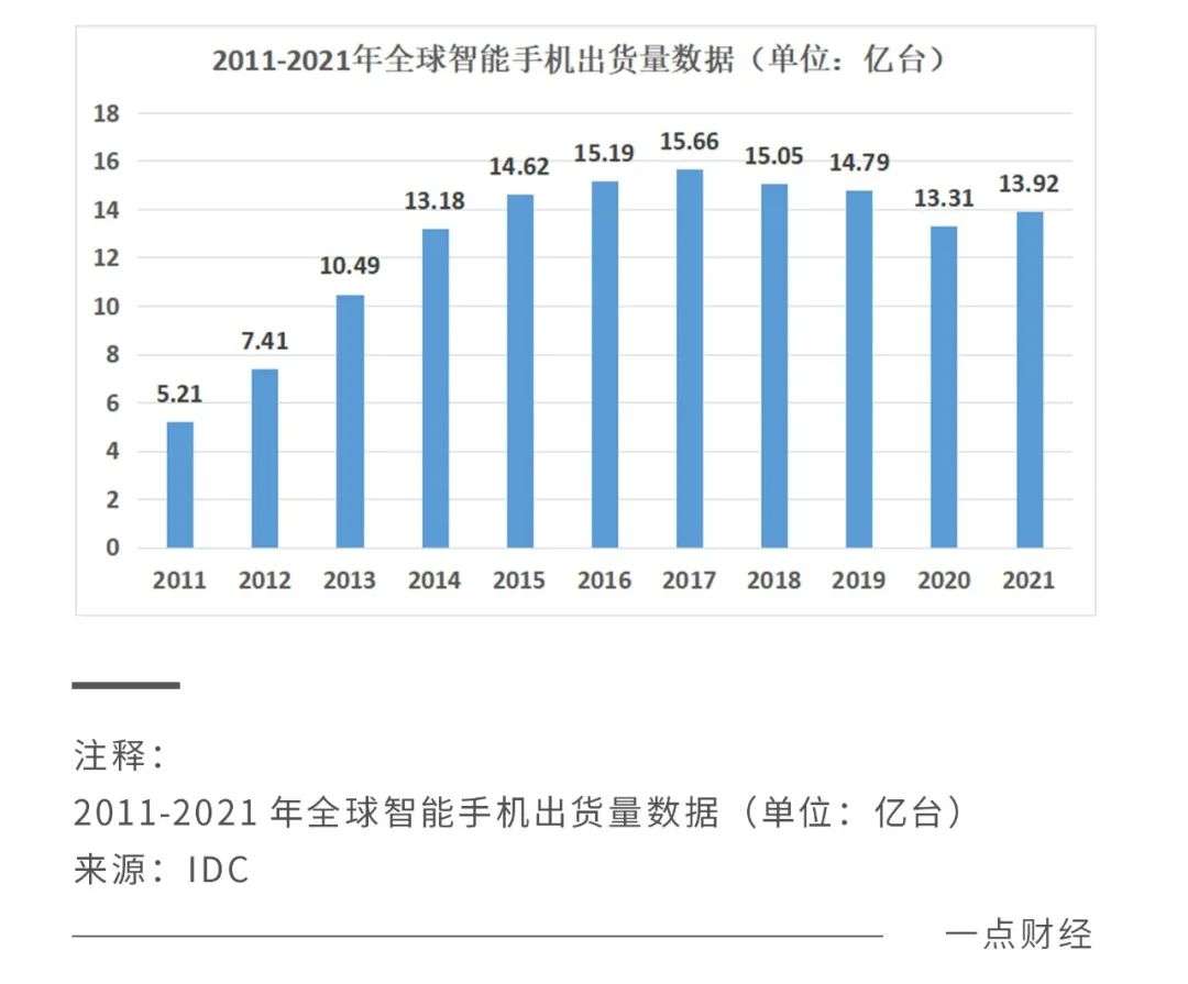 据IDC统计,全球手机出货量在2017年达到高峰的15.66亿台后,自2018年开始逐年下降,2020年骤然受疫情影响,降幅较大,2021年有所上升,但行业整体遇冷仍在继续。