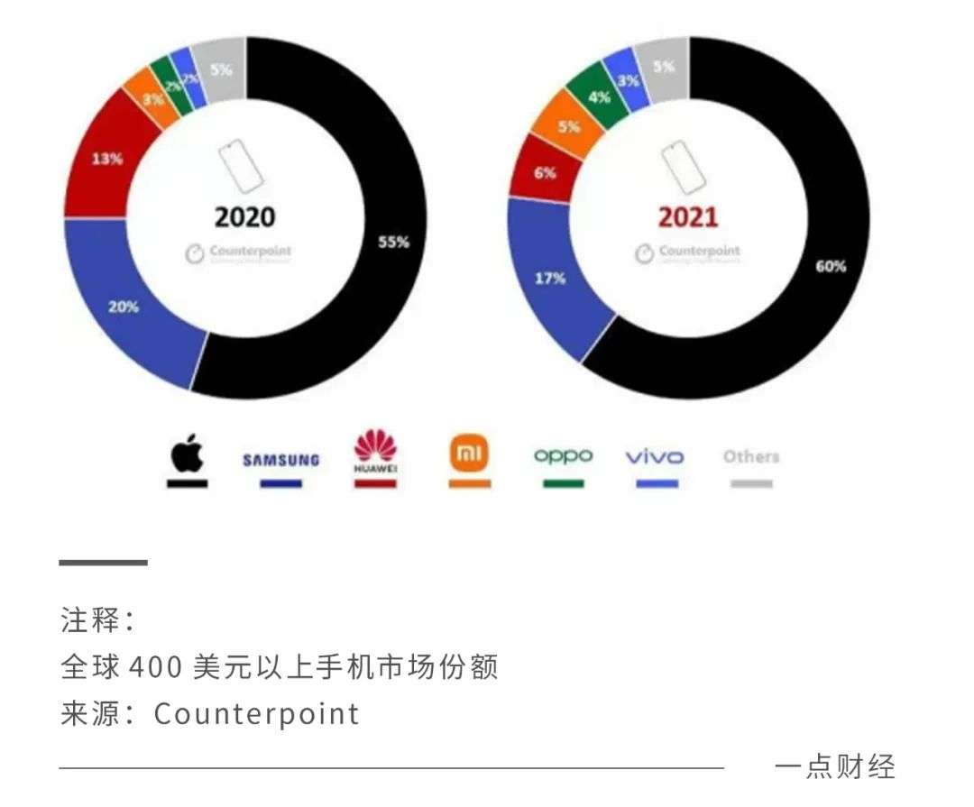 华为失速后,2021年全球高端手机(400美元以上)整体排名上,苹果以60%的占比取得绝对领先地位,三星以17%的份额占据第二位,华为、小米、OPPO分别以6%、5%、4%的份额位列第三至第五名,显然,华为让出的高端市场份额还是被苹果吞下了。