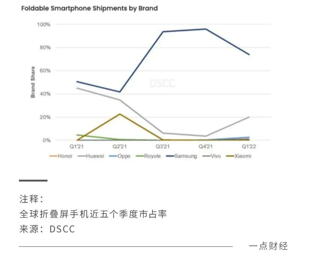 得益于产品优化和售价大幅降低,折叠屏销量迎来了小爆发,据咨询机构DSCC数据,2022年第一季度,全球折叠屏智能机总出货量为222万部,同比大涨了571%,其中三星品牌稳居第一。即使如此,与主流机型单品牌千万、上亿相比,折叠屏销量只能算是毛毛雨。
