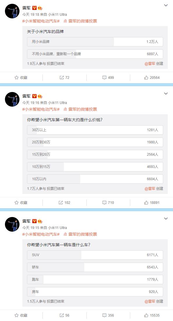 早在去年4月7日,小米CEO就在微博发起过关于米粉期待小米第一辆汽车的类型和价格投票,类型方面,SUV和轿车得票最多,价格方面则是10万以下得票最多,价格越高的选项,得票数就越低,分布非常均匀。