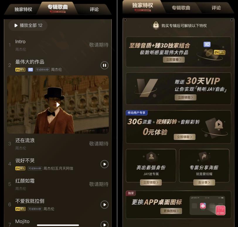 此外,咪咕音乐还为周杰伦新专辑准备了七大专属权益,涵盖独家的至臻音质(24bit)、臻3D等高品质音质、音/视频彩铃和来电铃声、30天白金会员、30G定向流量、JAY迷专属勋章、专属桌面图标、多样购买方式等,还能抽奖周杰伦亲笔签名周边、怀旧CD豪华礼包等超值奖品,真的没辜负“周杰伦播放器“的名号。