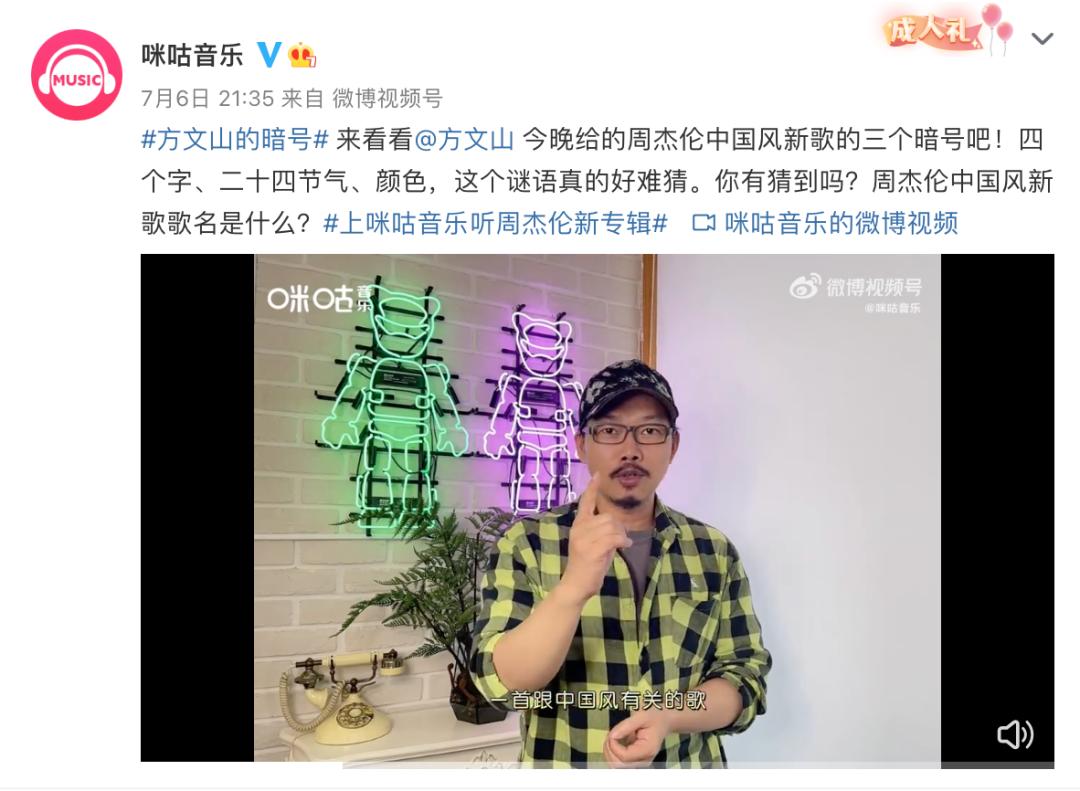 比如,在新专辑先行曲《最伟大的作品》MV上线的当晚8点,咪咕音乐特别邀请方文山,以及乐评人邓柯、呆若木一、资博和音乐人吴奇,在微博、咪咕音乐APP开展了预热直播连线活动,为新专辑预热。