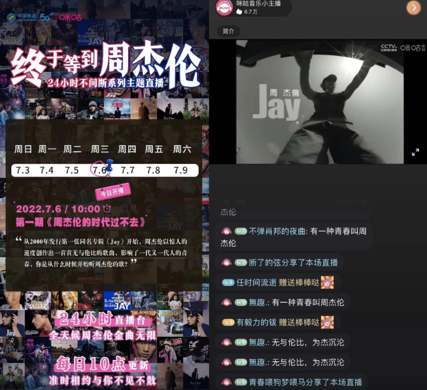 同时,在7月6 - 7月15日期间,咪咕音乐APP还进行了《终于等到周杰伦》为主题的24小时不间断系列直播,让杰迷在等待的日子里随时回味金曲、听到好歌,在《晴天》《半岛铁盒》《七里香》等一首首经典中梦回当年。
