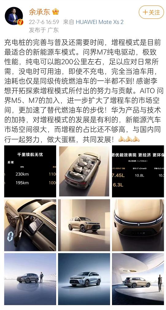 余承东回应外界对增程模式的批评时表示:增程模式目前是最适合的新能源车模式。