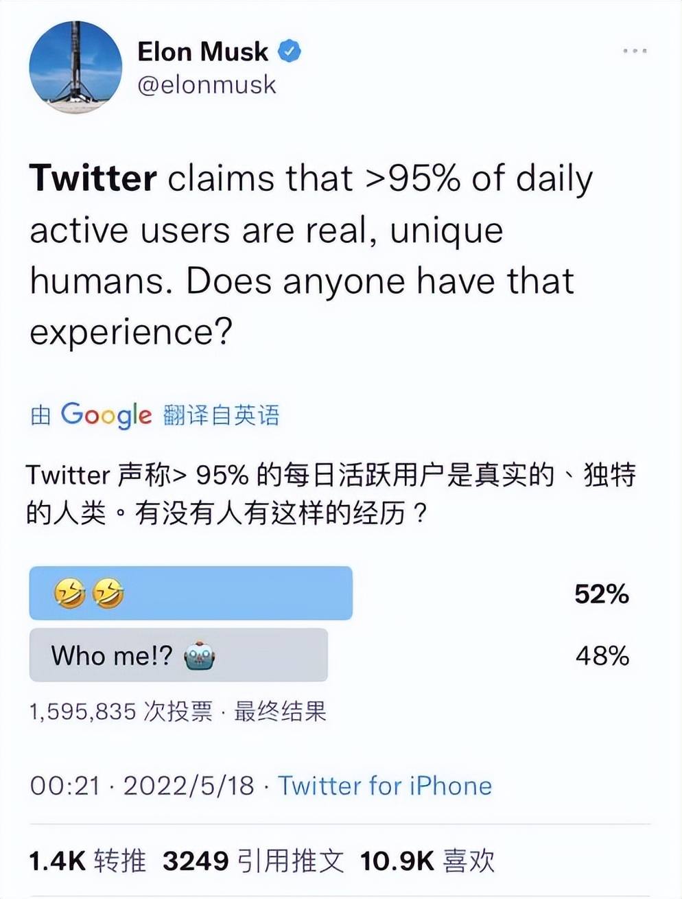 然后时间来到5月,马斯克开始第四幕的表演“5%风波”,揪住虚假账号的问题对推特发难,在买与不买之间横跳,这场收购也变成了“薛定谔的收购”。