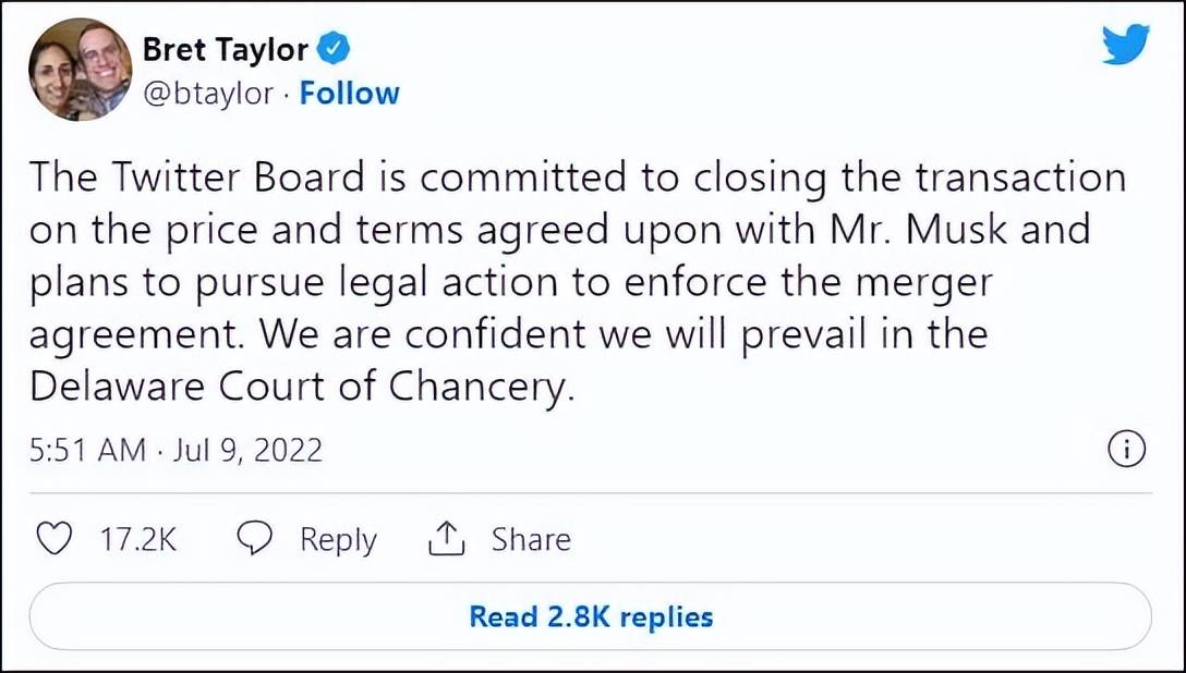 推特那边,董事会主席布雷特·泰勒(Bret Taylor)发推表示,董事会计划采取法律行动,以最初商定的价格和条款进行交易:“我们相信我们将在特拉华州衡平法院获胜。”