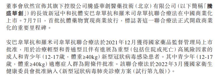 完成验证生产工艺等重要工作,并经过来自国家药品监督管理局(NMPA)、北京药监局、美国食品药品监督管理局(FDA)等部门的多次核查后,7月7日,腾盛博药发布公告,宣布了公司长效新冠中和抗体 安巴韦单抗和罗米司韦单抗联合疗法 在中国商业化上市的好消息。