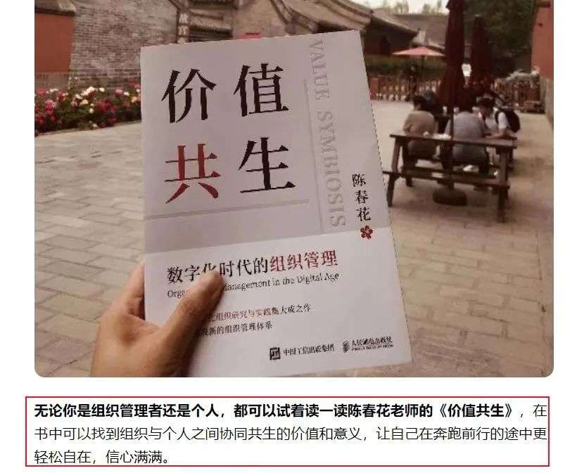 在一番大肆渲染之后,许多文章或视频尾部,都附有陈春花著作的购书链接,“无论你是打工人还是老板,如果想要升职加薪,改变人生,那就应该读读陈春花的《价值共生》”。
