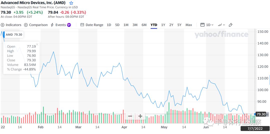 AMD在4月的时候,股价跌幅就已破40%,一个不怎么算好消息的消息是,到了7月,英伟达的跌幅已经反超AMD,不过AMD本身也已经高达47.22%。