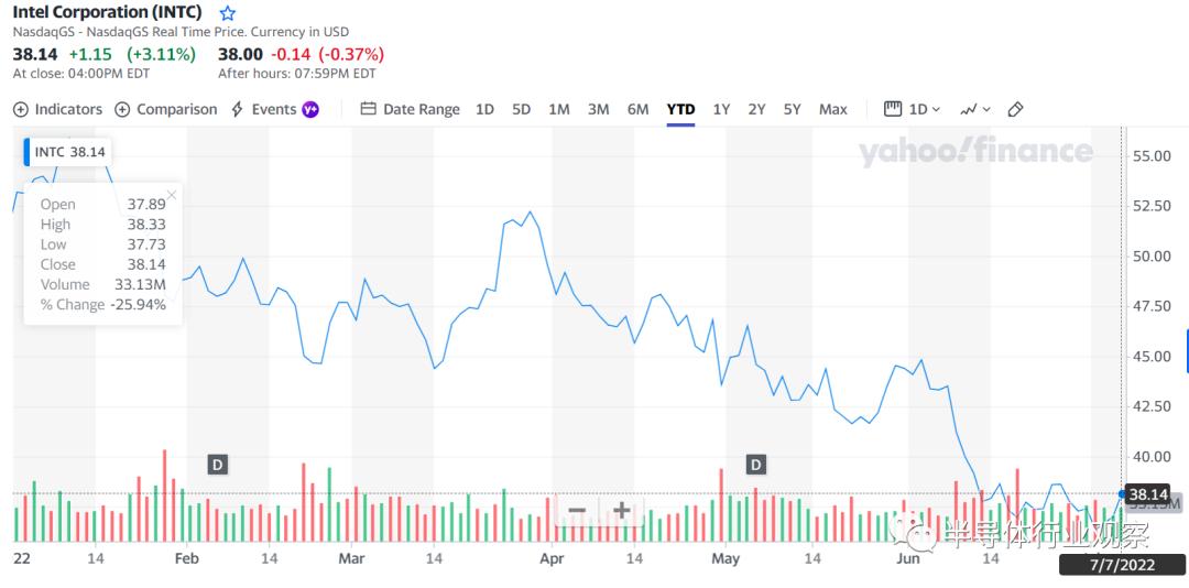 2022年英特尔开局股价达到53.21 美元,1月11日迎来了迄今为止的最高股价,55.91 美元,而7月7日当天的股价仅为38.14美元。