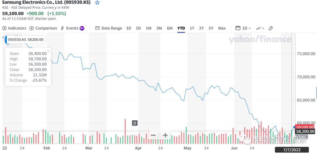 三星作为全球最大的存储芯片商,2022年迄今为止最高的股价为78900韩元,7月7日股价已跌至58200韩元。