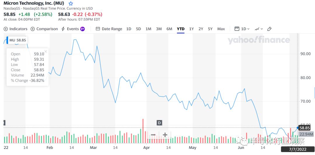 美光2022年迄今为止的股价最高点达到了97.36美元,而7月7日的股价仅为58.85美元,跌幅在三大存储厂商中居于首位,高达38.54%。