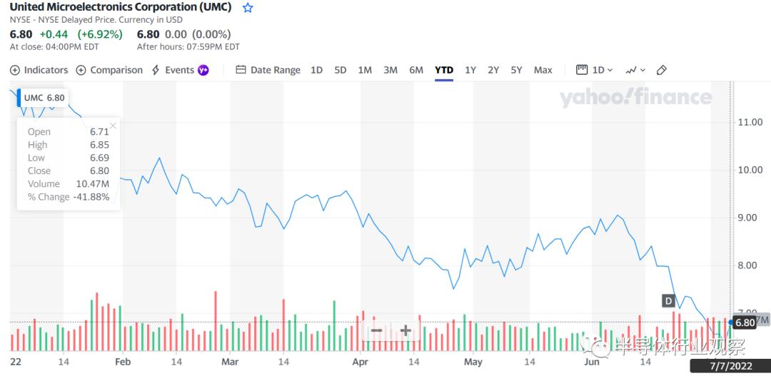 联电的股价在三家代工厂中跌幅最大,从年初的11.64美元,下跌至7月7日的6.8美元。