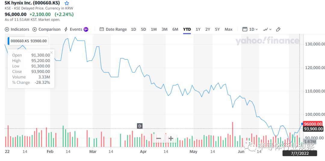 SK 海力士2022年迄今为止最高的股价为2月17日的133000 韩元,而其7月7日股价已跌至93900韩元,跌破100000韩元,跌幅近27%。