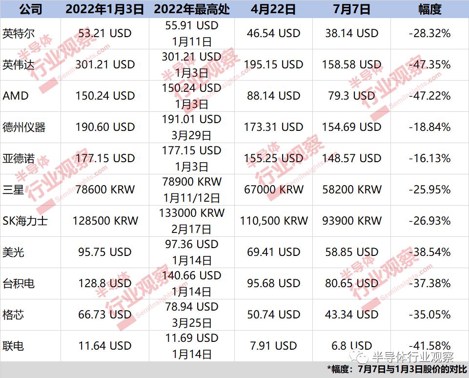 这段时期,半导体行业整体股价形势相信无需笔者过多赘言,QUICK FactSet统计显示,世界主要半导体相关企业(40家)的总市值截至7月1日为3万亿美元,与2021年底相比减少了近1.8万亿美元(4成)。