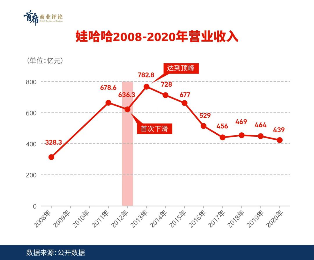 从娃哈哈近几年的公开数据中不难发现,危机和机遇一直如影如随。在2008年,娃哈哈集团营业收入达到328.3亿元,2011年达到了678.6亿元,2012年短暂下滑到636.3亿元后,2013年达到顶峰782.8亿元。而2014–2020年公司营收分别为728亿元、677亿元、529亿元、456亿元、469亿元、464亿元、439亿元,下跌幅度达到了42%,直到2021年才迎来了近几年的首次逆增长。