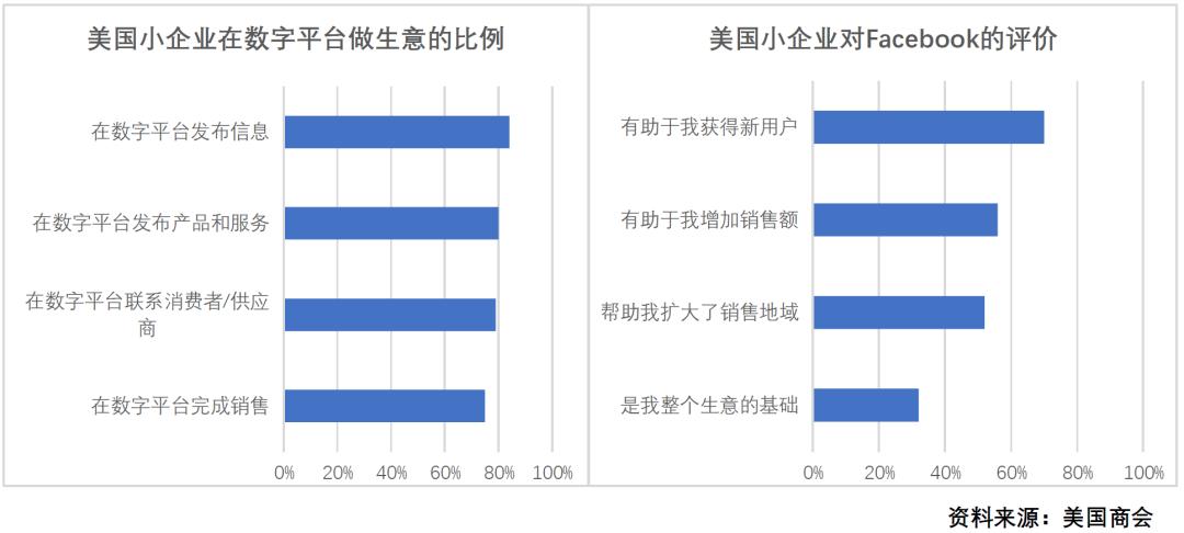 美国商会(U.S. Chamber of Commerce)于2021年进行的调查显示,美国小企业有80%在数字平台(社交媒体、搜索引擎、官网等)发布产品和服务,有75%通过数字平台完成销售;如果面向消费者的小企业缺乏线上渠道,消费者的购买意愿可能下降一半左右。此外,有80%的小企业认为Facebook有助于它们获得新客户,56%认为Facebook有助于增加销量,甚至有32%认为Facebook是自己“建立生意的基础”——这种企业一般要么采取纯线上销售,要么是所谓“鼠标加水泥”商业模式;它们广泛活跃于Amazon、Google、Instagram等一切大型平台。