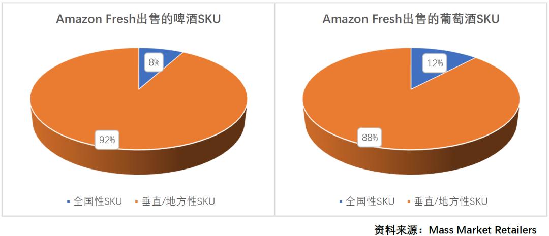 与此同时,本地日用品和农产品生产商反而会受益。市场研究机构Mass Market Retailer的调查显示,在Amazon Fresh实体门店出售的啤酒SKU当中,只有8%属于全国性SKU(在所有门店均可买到),剩下的都是地方性品类;葡萄酒则只有12%属于全国性SKU。有趣的是,Amazon Fresh门店的平均SKU数量却远远低于传统连锁零售店——也就是说,前者比后者更加本地化,更加依赖垂类和中小型生产商。
