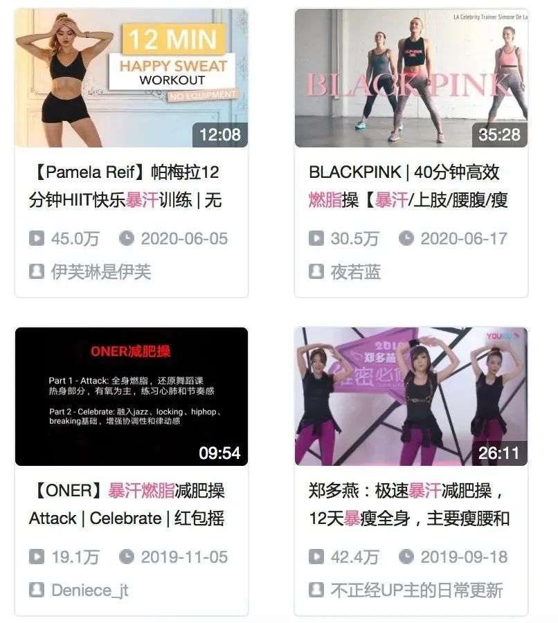 B站「暴汗燃脂」课程点击量最多的视频超200万,评论中多有「出汗后的感觉很好」等运动感受的分享,运动体验与汗水在健身者主观上是呈正比例相关的。