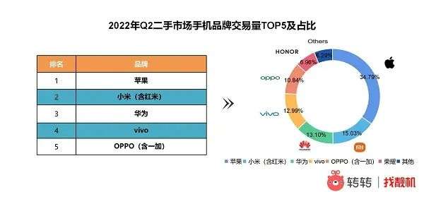 在二手市场也是如此,根据转转集团最新发布的Q2手机行情报告显示,苹果iPhone以34.79%的交易量排名二手市场品牌榜第一。