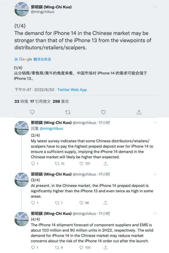 天风国际分析师郭明錤通过海外社交平台表示,以他对中国经销商、零售商和黄牛的调查来看,中国市场对iPhone 14的需求可能会强于iPhone 13。他们为 iPhone 14 支付了“有史以来最多的预付定金”。